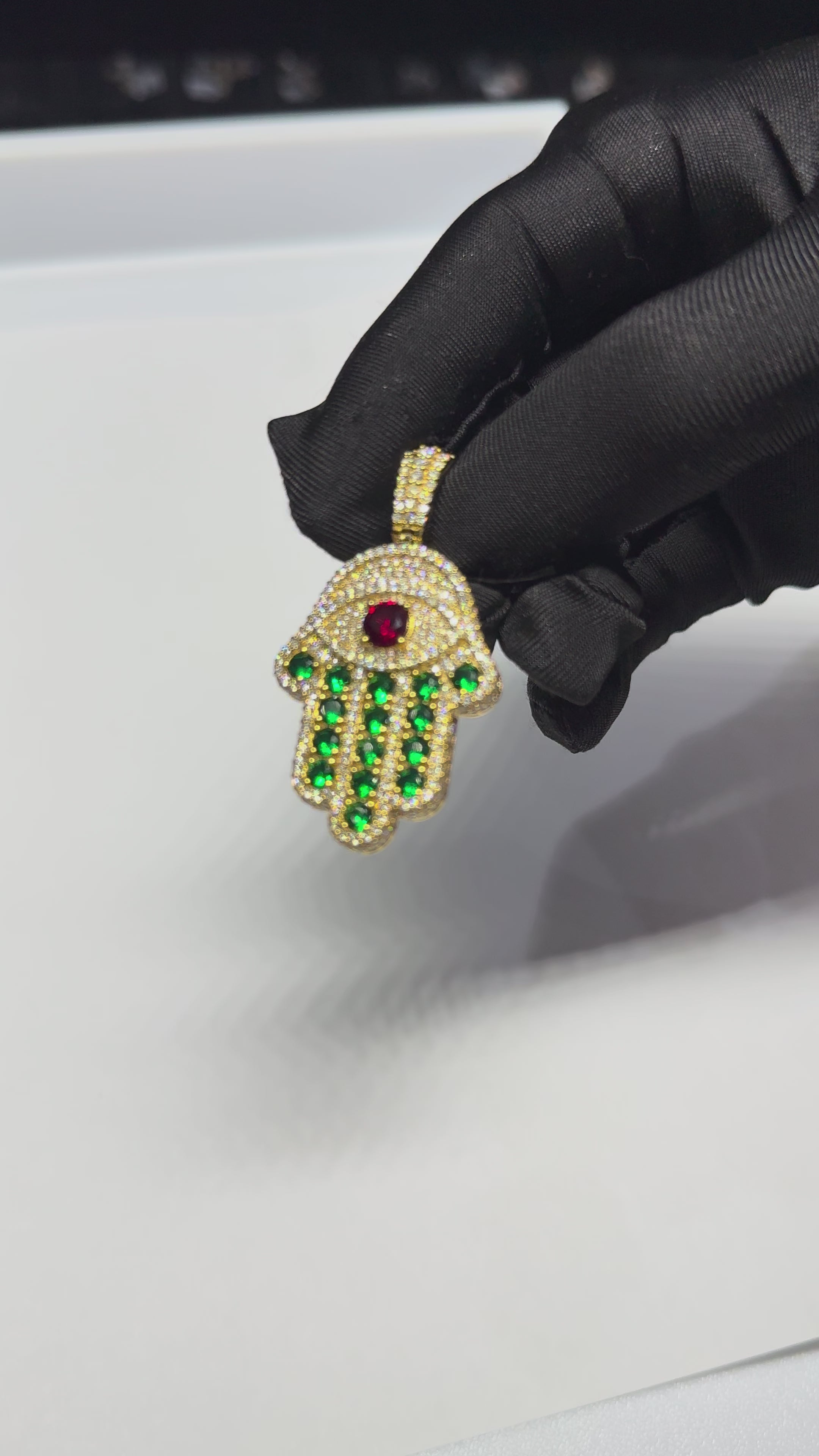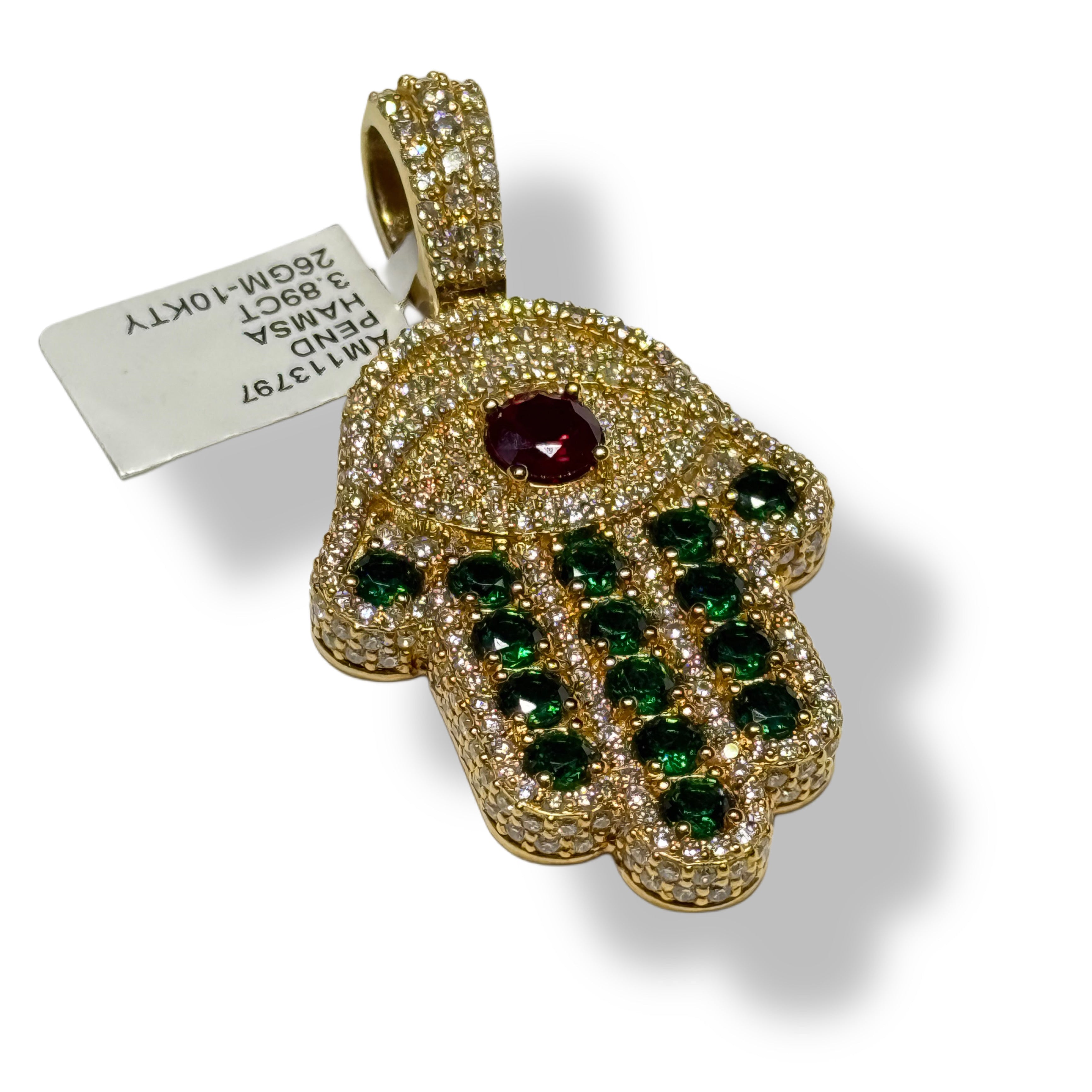 The Hamsa pendant, crafted from 10 Karat gold and adorned with natural Vs diamonds, green Emeralds, and a centered Red ruby, is more than just a stunning piece of jewelry. It is also a powerful symbol of protection and good fortune. Let the Hamsa bring its positive energy into your life!